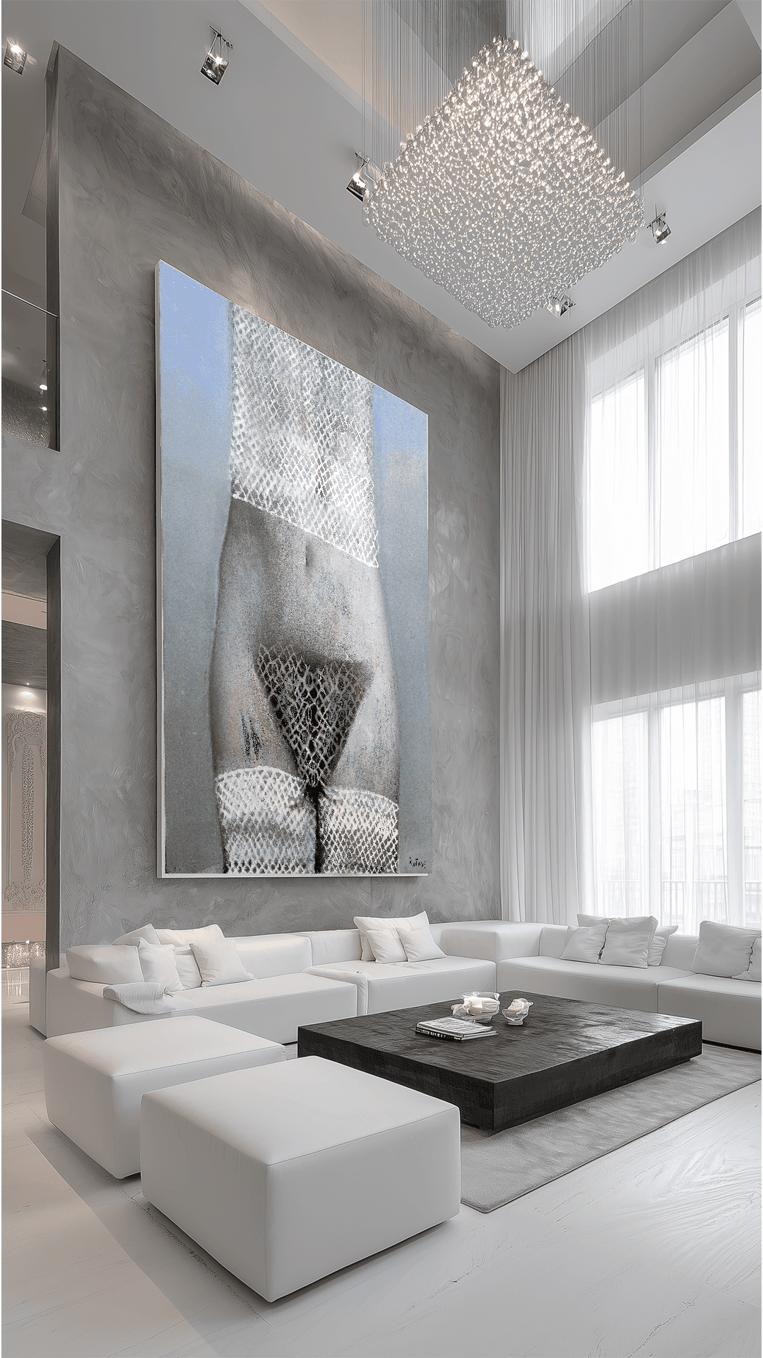 Arūnas Rutkus' Silver Period is a mesmerizing interplay of light, texture, and emotion, where metallic hues evoke a sense of mystery, resilience, and transformation. Through a refined grayscale palette, Rutkus crafts figures that seem both tangible and ephemeral—emerging from and dissolving into shimmering voids. His use of intricate patterns, reminiscent of woven fabric or reptilian skin, symbolizes protection, identity, and metamorphosis, enveloping his subjects in an aura of both strength and fragility.